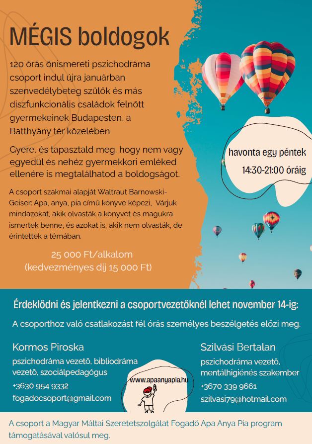Mégis boldogok – új pszichodráma önismereti csoport indul szenvedélybeteg és más diszfunkcionális családok felnőtt gyermekeinek. A csoport nevét Waltraut Barnowki-Geiser Apa, anya, pia – Hogyan találhatják meg a szenvedélybeteg szülők gyermekei MÉGIS a boldogságot című könyve ihlette.
